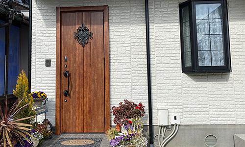 玄関がお住いの外観、外構のイメージと合わないとのことで交換します。